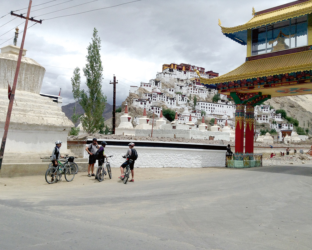 Mit der Fortsetzung der spektakulären Abfahrt hinunter nach Upshi über weitere 30 km verändert sich die Szenerie dramatisch, erreichen wir doch nun das fruchtbare Indus-Tal mit bewässerten Feldern, freundlichen Dörfern und eindrucksvollen Stupas. Das Rot der uns umgebenden Berge unterstreicht noch die Schönheit und den Reichtum dieser Gegend. Nach der Überquerung des Indus folgen wir der besser werdenden Straße nach Leh. Bis zur Army Base in Karu bleibt es wegen des Windes und des Profils sehr anstrengend. Später stoppen wir zu einer Visite mit anschließendem Lunch am Kloster Thikse und seinen Gärten. Unseren Zielort Leh erreichen wir am Nachmittag über einen finalen giftigen Anstieg. Das Jigmet Hotel mit seiner Garten-Oase entschädigt dann aber für alle Anstrengungen.